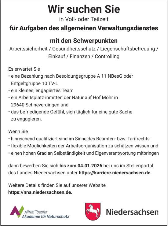 dann bewerben Sie sich bis zum 04.01.2026 bei uns im Stellenportal des Landes Niedersachsen unter https://karriere.niedersachsen.de.