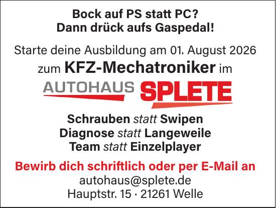 Bewirb dich schriftlich oder per E-Mail an: autohaus@splete.de
