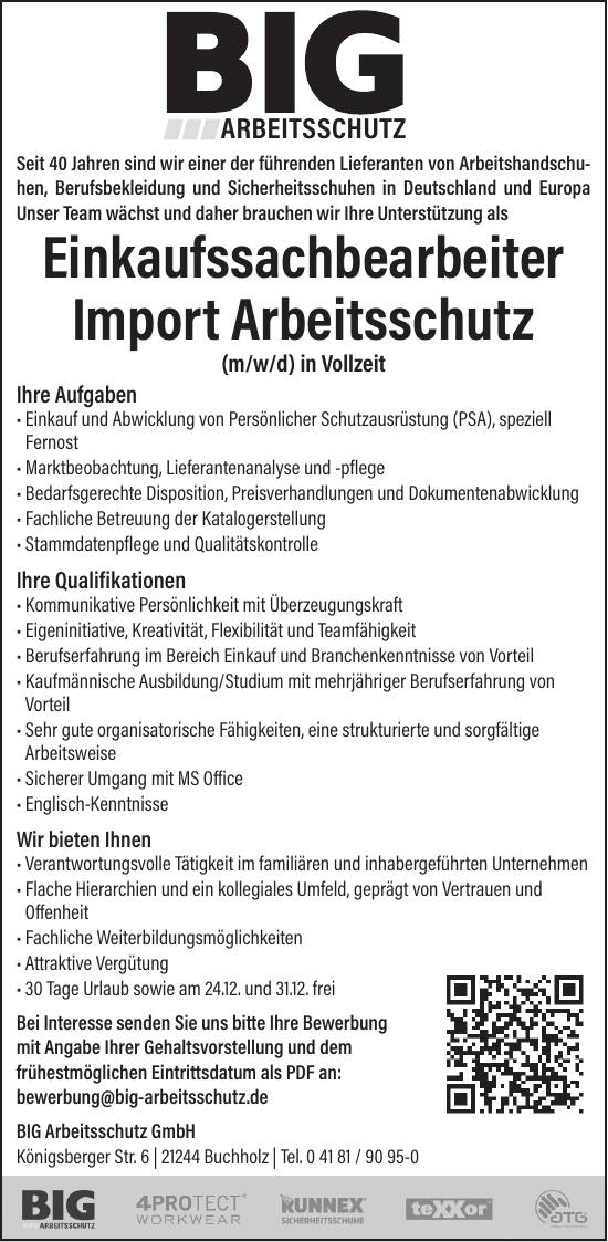 Einkaufssachbearbeiter Import Arbeitsschutz (m/w/d) in Vollzeit