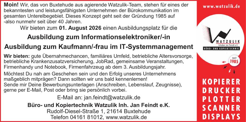 - Post: Büro- und Kopiertechnik Watzulik Inh. Jan Feindt e.K., Rudolf-Diesel-Straße 1, 21614 Buxtehude