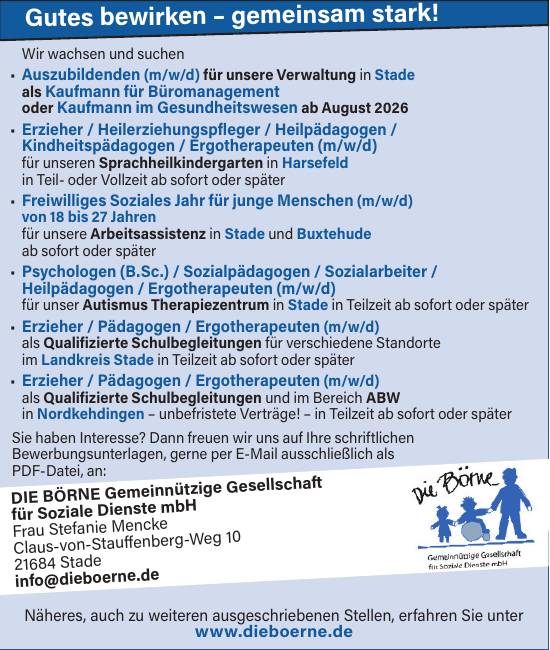 Auszubildenden (m/w/d) für Verwaltung in , Erzieher / Heilerziehungspfleger / Heilpädagogen / Kindheitspädagogen / Ergotherapeuten (m/w/d) in Harsefeld , Freiwilliges Soziales Jahr für junge Menschen (m/w/d) in , Psychologen (B.Sc.) / Sozialpädagogen / Sozialarbeiter / Heilpädagogen / Ergotherapeuten (m/w/d) in , Erzieher / Pädagogen / Ergotherapeuten (m/w/d) in , Erzieher / Pädagogen / Ergotherapeuten (m/w/d) in