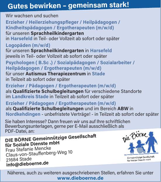 Erzieher / Heilerziehungspfleger / Heilpädagogen / Kindheitspädagogen / Ergotherapeuten (m/w/d) in Harsefeld , Logopäden (m/w/d) in Harsefeld , Psychologen (B.Sc.) / Sozialpädagogen / Sozialarbeiter / Heilpädagogen / Ergotherapeuten (m/w/d) in Stade , Erzieher / Pädagogen / Ergotherapeuten (m/w/d) in Stade , Erzieher / Pädagogen / Ergotherapeuten (m/w/d) in