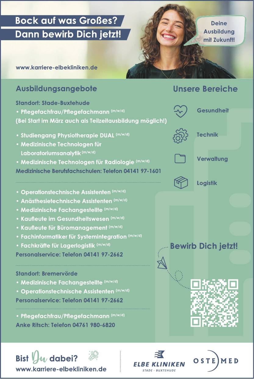 Ausbildung Pflegefachfrau / Pflegefachmann (m/w/d) in , Studiengang Physiotherapie DUAL (m/w/d) in , Ausbildung Medizinische Technologen für Laboratoriumsanalytik (m/w/d) in , Ausbildung Medizinische Technologen für Radiologie (m/w/d) in , Ausbildung Operationstechnische Assistenten (m/w/d) in , Ausbildung Anästhesietechnische Assistenten (m/w/d) in , Ausbildung Medizinische Fachangestellte (m/w/d) in , Ausbildung Kaufleute im Gesundheitswesen (m/w/d) in , Ausbildung Kaufleute für Büromanagement (m/w/d) in , Ausbildung Fachinformatiker für Systemintegration (m/w/d) in , Ausbildung Fachkräfte für Lagerlogistik (m/w/d) in , Ausbildung Medizinische Fachangestellte (m/w/d) in Bremervörde , Ausbildung Operationstechnische Assistenten (m/w/d) in Bremervörde , Ausbildung Pflegefachfrau / Pflegefachmann (m/w/d) in Bremervörde