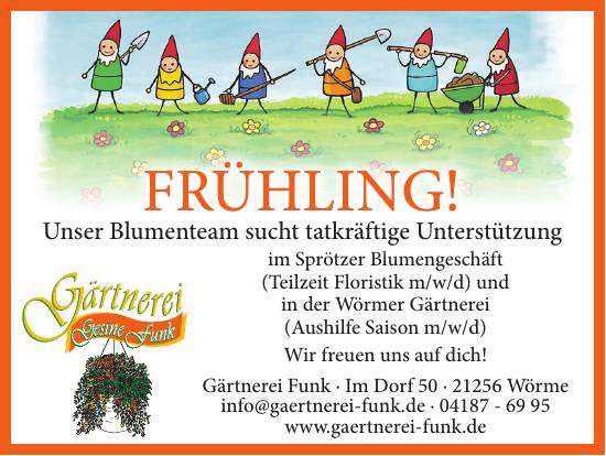 im Sprötzer Blumengeschäft (Teilzeit Floristik m/w/d) und in der Wörmer Gärtnerei (Aushilfe Saison m/w/d)