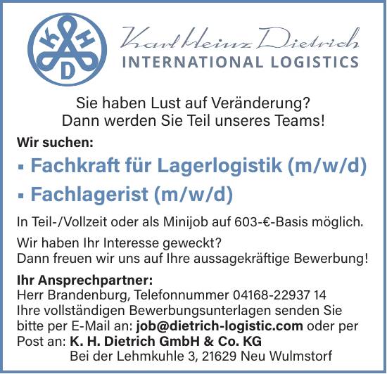 Ihre vollständigen Bewerbungsunterlagen senden Sie bitte per E-Mail an: job@dietrich-logistic.com oder per Post an: