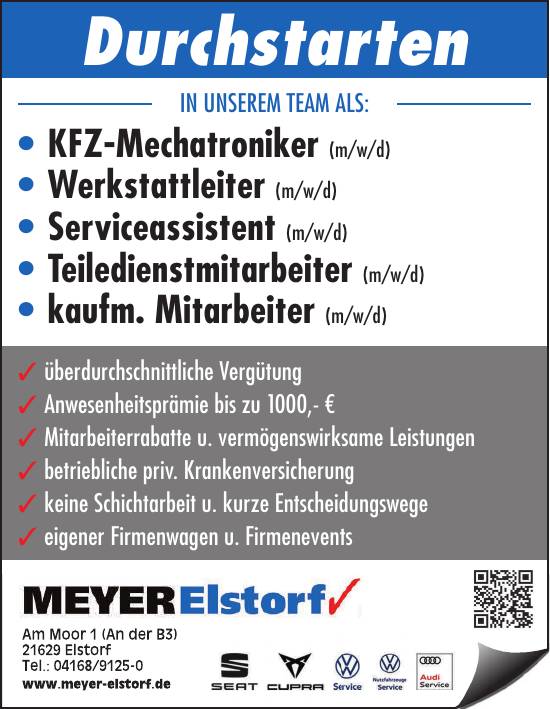 Alle AnzeigenKFZ-Mechatroniker (m/w/d) in , Werkstattleiter (m/w/d) in , Serviceassistent (m/w/d) in , Teiledienstmitarbeiter (m/w/d) in , Kaufm. Mitarbeiter (m/w/d) in