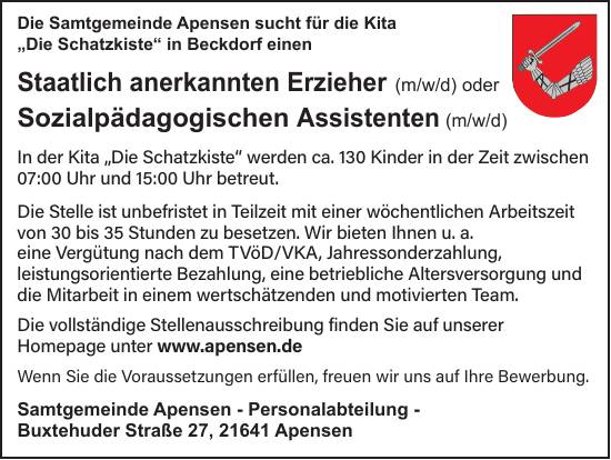Die Samtgemeinde Apensen sucht für die Kita „Die Schatzkiste“ in Beckdorf einen