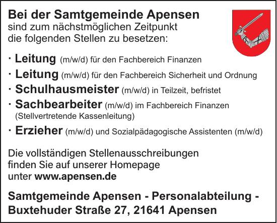 Bei der Samtgemeinde Apensen sind zum nächstmöglichen Zeitpunkt die folgenden Stellen zu besetzen: