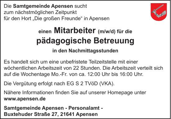 Die Samtgemeinde Apensen sucht zum nächstmöglichen Zeitpunkt für den Hort „Die großen Freunde“ in Apensen: