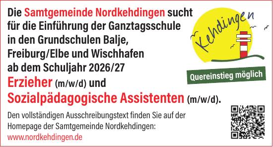 Die Samtgemeinde Nordkehdingen sucht für die Einführung der Ganztagsschule in den Grundschulen Balje, Freiburg/Elbe und Wischhafen ab dem Schuljahr 2026/27: