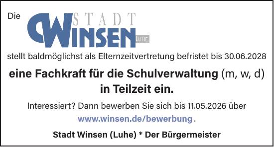 Die Stadt Winsen (Luhe) stellt baldmöglichst als Elternzeitvertretung befristet bis 30.06.2028 eine