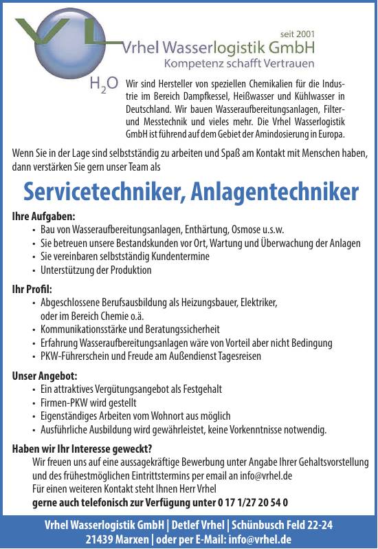 • Erfahrung Wasseraufbereitungsanlagen wäre von Vorteil aber nicht Bedingung
